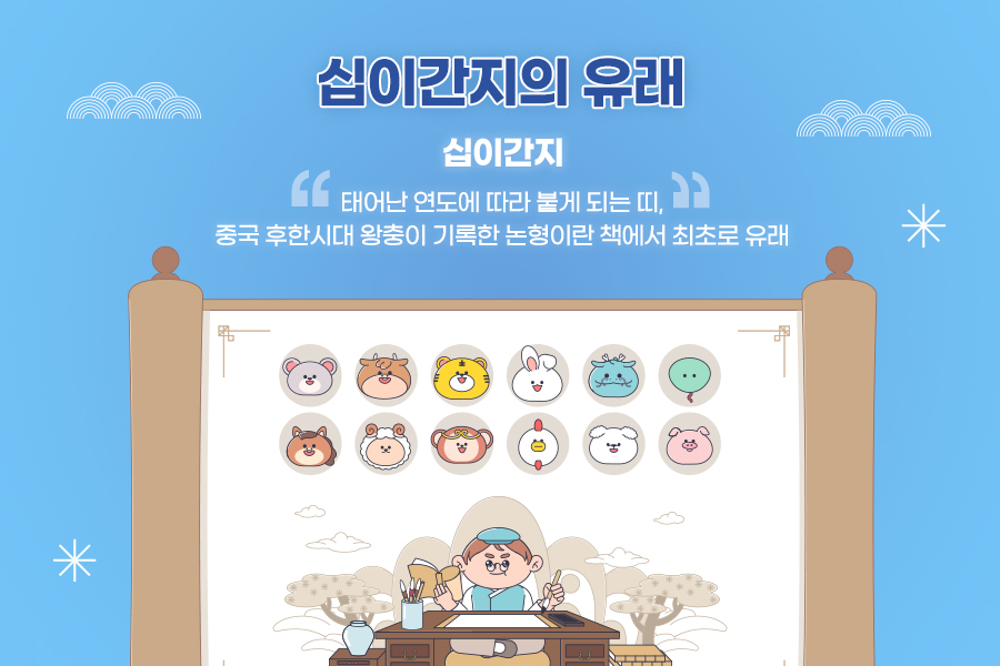 쥐(자), 소(축), 호랑이(인), 토끼(묘), 용(진), 뱀(사), 말(오), 양(미), 원숭이(신), 닭(유), 개(술), 돼지(해)가 십이간지의 순서이며 예부터 십이지와 십간을 조합하고 <시, 일, 달, 해>에 이름을 붙여 인간과 우주의 조화, 만물의 흐름을 알아보았다고 합니다.