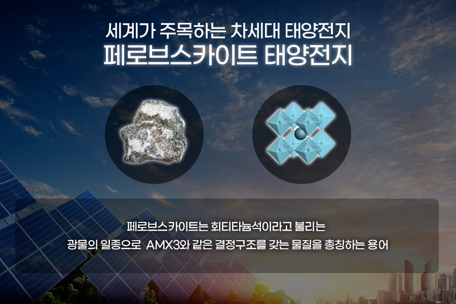 페로브스카이트는 세계가 주목하는 친환경 에너지입니다. 육방면체 구조를 지닌 반도체 물질로 회티타늄석이라고 불리며 러시아 광물학자 페로브스키가 1839년 우랄산맥에서 처음 발견하여 그의 이름을 따서 만들어졌습니다.