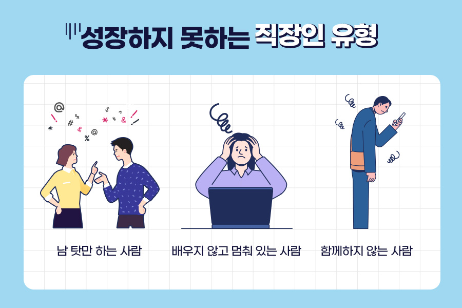 수평적인 성장을 통해 이러한 긍정적인 효과를 보는 사람이 있는 반면, 성장하지 못하는 직장인도 있는데요. 그들의 유형은 다음과 같습니다.