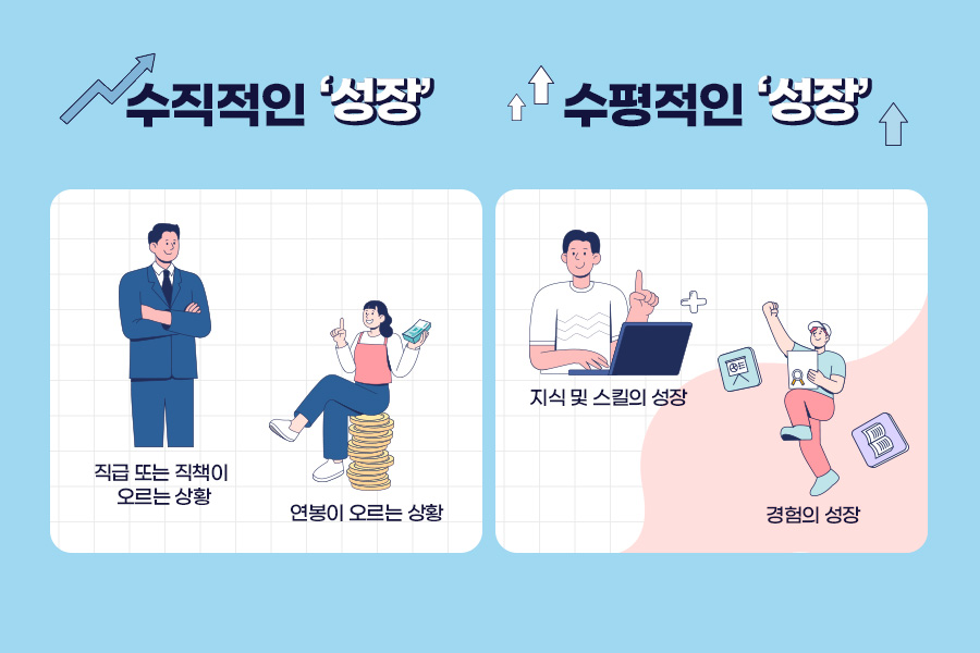 수직적인 성장이 연봉이 오르거나 직급 또는 직책이 오르는 등 당장의 변화가 보이는 눈에 보이는 성장이라면, 수평적인 성장은 지식과 경험이 많아지거나 스킬이 향상되는 등 눈에 보이지는 않지만 내면이 깊어지는 성장입니다.