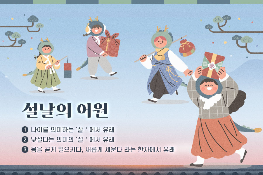 두 번째, 낯설다는 의미의 설에서 유래되었으며 새로운 한 해를 맞이하며 새로운 장소와 사람을 만나 낯선 날이라는 뜻에서 설날이라 불리게 되었다는 어원.