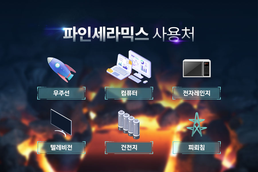 파인세라믹스는 전기적, 광학적, 화학적 등 거의 모든 면에서 금속 재료나, 복합 재료보다 우수하여 다양한 산업에서 사용되고 있습니다. 파인세라믹스 실리카 타일이 부착된 우주선은 우주에서 대기권을 탈출하거나 귀환할 때 사용되는데요. 외부의 온도는 무려 1500도 이상에 달하는데 파인세라믹스 덕분에 내부는 조금 따뜻해지는 수준이라고 합니다. 이 외에도 전자레인지, 컴퓨터, 냉장고, 전자회로, 피뢰침, 건전지, 광통신 케이블 등 다양한 분야에서 사용되고 있답니다.