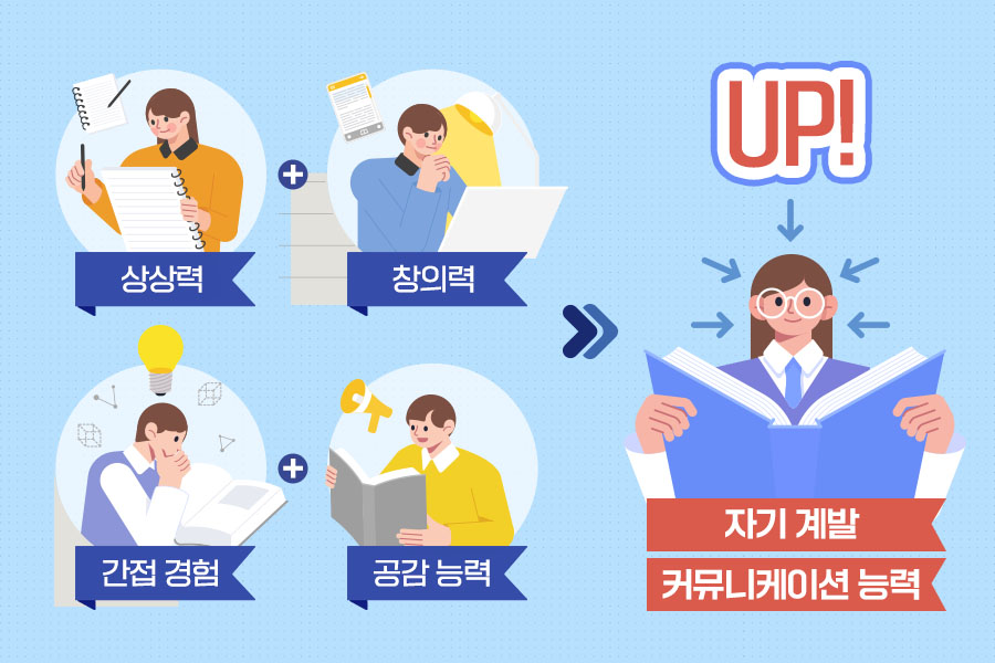 독서는 상상력과 창의력을 키우는 데 도움을 주어 업무 역량 향상에 도움을 줄 뿐만 아니라, 원활한 대인 관계 형성에 필요한 다양한 시각과 경험을 간접적으로 느낄 수 있게 해줍니다.