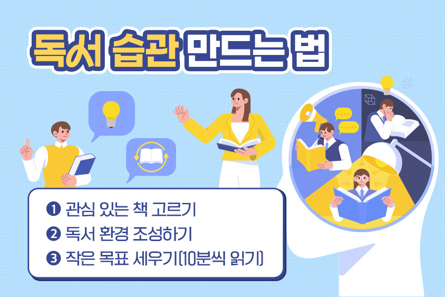 우선 흥미를 가질 수 있는 책을 고른 후 마음이 편안한 장소를 찾아 독서 환경을 조성하는 것이 좋습니다. 매일 많은 분량의 책을 읽으려고 하지 말고, 10분씩 읽기 등의 작은 목표를 세워 실천하다 보면 어느새 독서 습관을 형성한 자기 모습을 확인할 수 있을 것입니다.