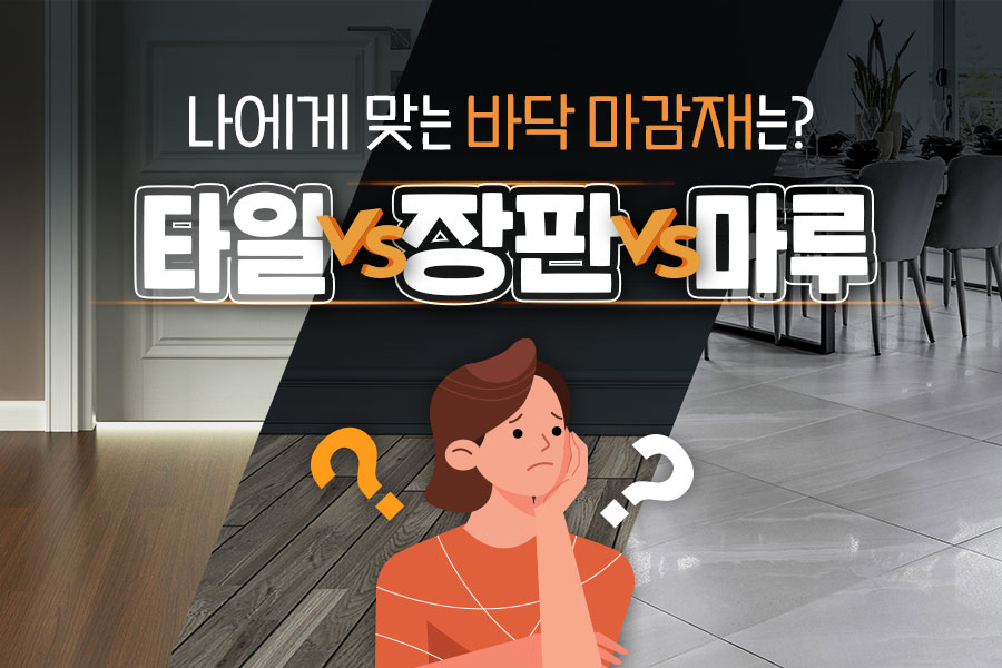 바닥마감재는 크게 타일, 장판, 마루로 구성되어 있으며 각 마감재에 따른 장단점이 명확하므로 이를 따져 본인에게 맞는 마감재로 진행하는 것이 중요합니다.