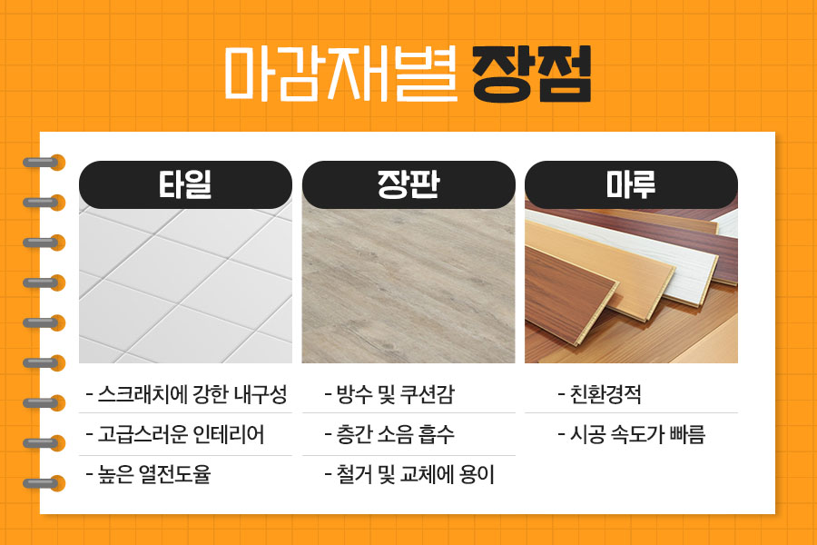 바닥마감재는 크게 타일, 장판, 마루로 구성되어 있으며 각 마감재에 따른 장단점이 명확하므로 이를 따져 본인에게 맞는 마감재로 진행하는 것이 중요합니다.