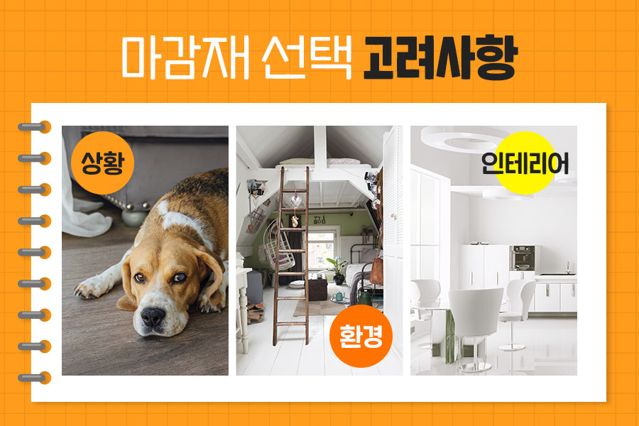 이렇듯 마감재마다 장단점이 명확하여 바닥마감재 선택에 용이할 것 같지만 상황, 환경, 인테리어 등 외적인 부분에서 고려해야 할 부분도 많습니다.