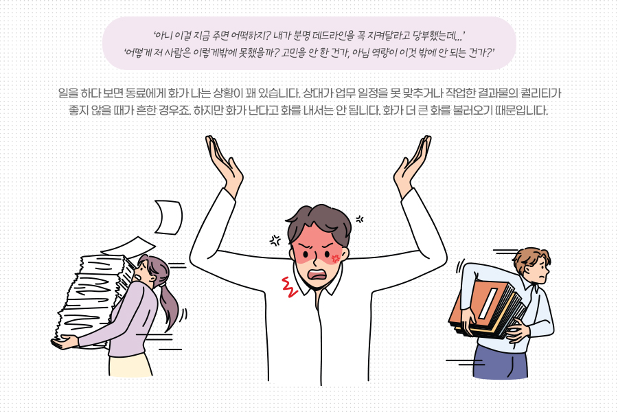 일을 하다 보면 동료에게 화가 나는 상황이 꽤 있습니다. 상대가 업무 일정을 못 맞추거나 작업한 결과물의 퀄리티가 좋지 않을 때가 흔한 경우죠. 하지만 화가 난다고 화를 내서는 안 됩니다. 화가 더 큰 화를 불러오기 때문입니다.