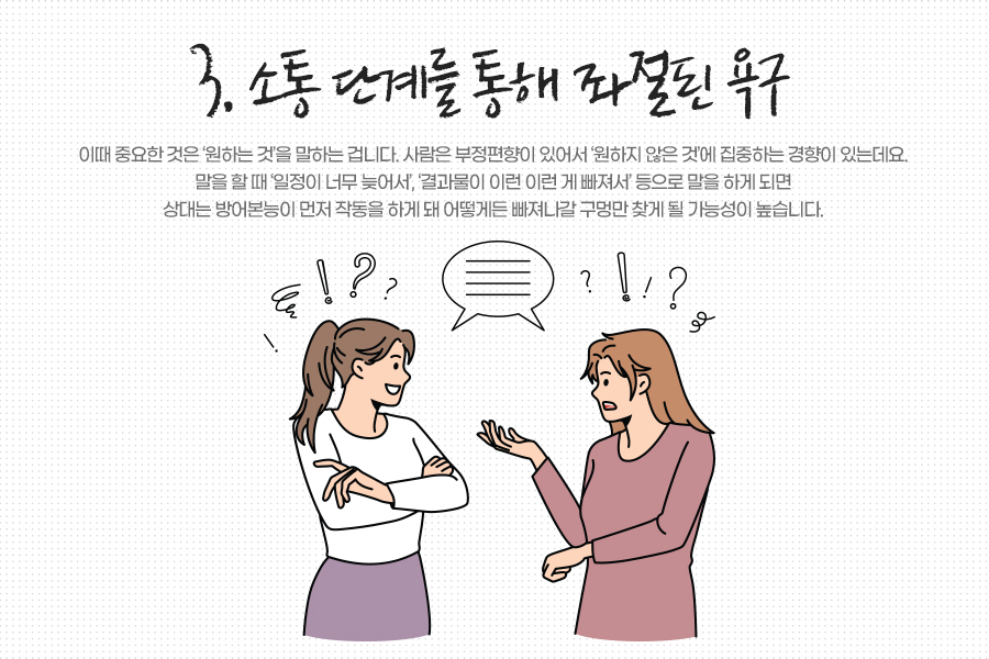 마지막 셋째, 소통하기 단계를 통해 내 좌절된 욕구에 대해 얘기하는 겁니다. 이때 중요한 것은 ‘원하는 것’을 말하는 겁니다. 사람은 부정편향이 있어서 ‘원하지 않은 것’에 집중하는 경향이 있는데요. 말을 할 때 ‘일정이 너무 늦어서’, ‘결과물이 이런 이런 게 빠져서’ 등으로 말을 하게 되면 상대는 방어본능이 먼저 작동을 하게 돼 어떻게든 빠져나갈 구멍만 찾게 될 가능성이 높습니다. 그러니 ‘난 OO프로젝트를 차질 없이 해내고 싶다’와 같이 내가 궁극적으로 원하는 것을 말하고 ‘다음엔 일정이 지켜지기를, 그리고 요구했던 사항에 다 맞춰진 결과물을 건네 받을 수 있기를’ 요청하는 것이 더 현명한 처사입니다.