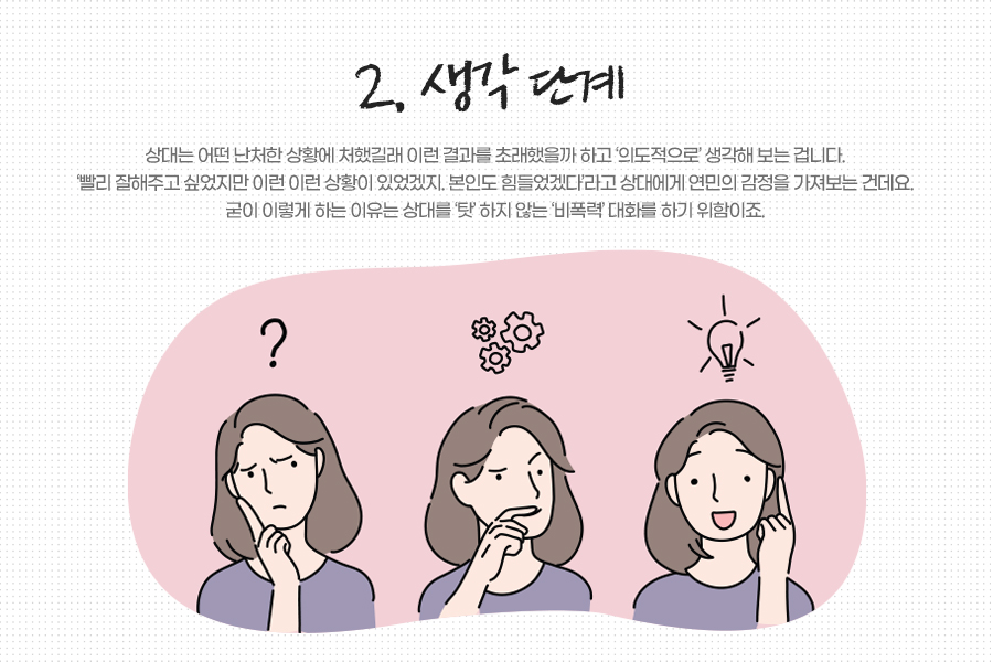 둘째 단계는 생각 단계입니다. 상대는 어떤 난처한 상황에 처했길래 이런 결과를 초래했을까 하고 ‘의도적으로’ 생각해 보는 겁니다. ‘빨리 잘해주고 싶었지만 이런 이런 상황이 있었겠지. 본인도 힘들었겠다’라고 상대에게 연민의 감정을 가져보는 건데요. 굳이 이렇게 하는 이유는 상대를 ‘탓’ 하지 않는 ‘비폭력’ 대화를 하기 위함이죠.