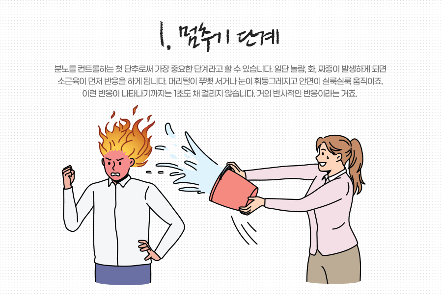 실제 분노라는 감정에 맞닥뜨렸을 때는 3단계의 행동수칙을 적용해 보기 바랍니다. 첫째, 멈추기 단계입니다. 분노를 컨트롤하는 첫 단추로써 가장 중요한 단계라고 할 수 있습니다. 일단 놀람, 화, 짜증이 발생하게 되면 소근육이 먼저 반응을 하게 됩니다. 머리털이 쭈뼛 서거나 눈이 휘둥그레지고 안면이 실룩실룩 움직이죠. 이런 반응이 나타나기까지는 1초도 채 걸리지 않습니다. 거의 반사적인 반응이라는 거죠. 이 반응은 내가 조절하기 쉽지 않지만 크게 문제가 될 상황을 만들지는 않습니다.
