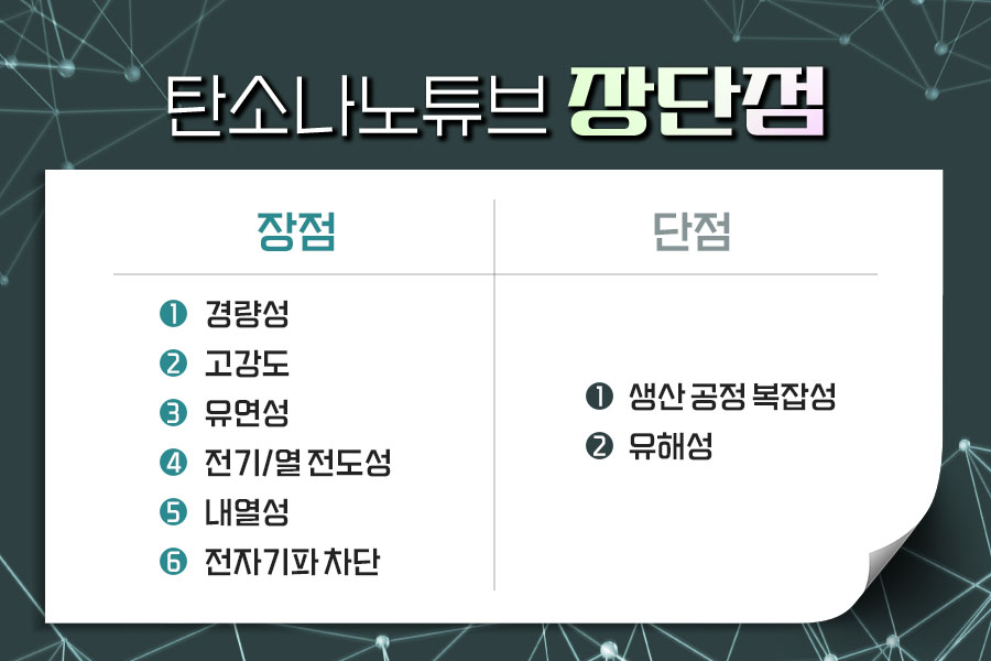 이렇게 활발히 연구되며 다양한 제조방법을 가지고 있는 탄소나노튜브의 장단점은 아래와 같은데요.