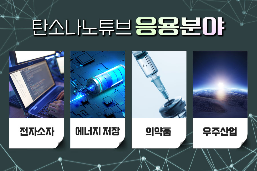 전도성 기판, 반도체회로와 같은 전자 소자뿐만 아니라 전기차 배터리의 소재로 에너지 저장 장치로도 사용되고 있으며 LG화학은 탄소나노튜브의 생산을 확대하여 전기차 배터리 시장을 공략하고 있다고 하니 얼마나 좋은 소재인지를 알 수 있는데요. 이 외에도 유전잔 진단, 암 치료 등의 의약품 그리고 항공우주 산업에서도 활발히 활용되고 있습니다.