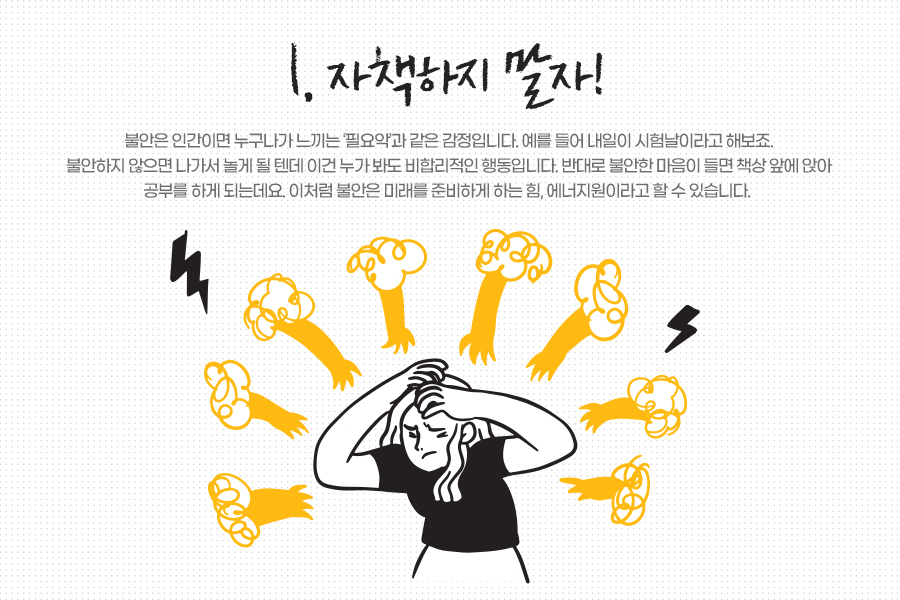 이럴 때 흔히 선택하게 되는 행동은 미루기와 같은 ‘회피’, 사소한 것에 집착하기와 같은 ‘과잉행동’, 다른 사람에게 어떻게 할까 계속 묻기와 같은 ‘의존’입니다. 이런 행동은 불안을 누그러뜨리기 위해 나름 선택한 심리적 방어기제라고 할 수 있습니다. 그런데 이런 행동들이 반복되면 ‘대체 난 왜 이러나’하고 자책하는 경우가 많이 생깁니다. 불안을 다스리려면 이렇게 스스로를 공격하는 데 기운을 뺏기지 말고 ‘실수 없이 해내고 싶고, 맡은 바 소임을 더 잘하고 싶어서 그러는구나’하고 나의 불안을 그대로 인정해줘야 합니다. 중요한 것은 불안이란 감정의 노예가 되지 않고 내가 그 감정의 주인으로서 불안을 잘 이용하려는 자세라고 할 수 있겠죠.