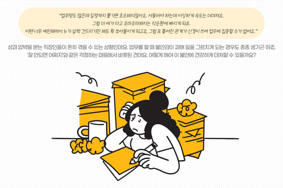 성과 압박을 받는 직장인들이 흔히 겪을 수 있는 상황인데요. 업무를 할 때 불안감이 과해 일을 그르치게 되는 경우도 종종 생기곤 하죠. ‘잘 안되면 어쩌지’와 같은 걱정하는 마음에서 비롯된 건데요. 어떻게 해야 이 불안에 건강하게 대처할 수 있을까요?