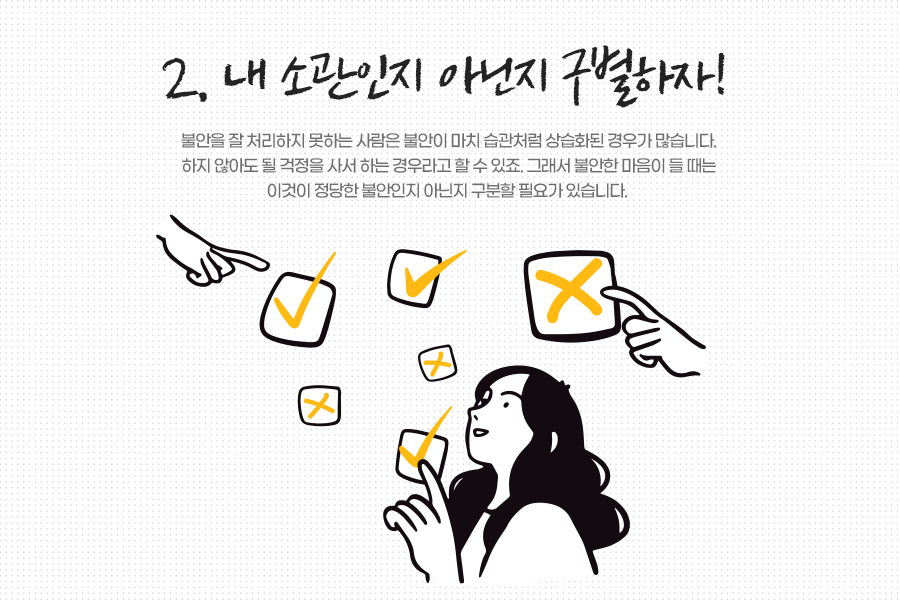 불안을 잘 처리하지 못하는 사람은 불안이 마치 습관처럼 상습화된 경우가 많습니다. 하지 않아도 될 걱정을 사서 하는 경우라고 할 수 있죠. 그래서 불안한 마음이 들 때는 이것이 정당한 불안인지 아닌지 구분할 필요가 있습니다.