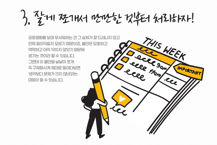 공포영화를 보며 무서워하는 건 그 실체가 잘 드러나지 않고 언제 들이닥칠지 모르기 때문이죠. 불안은 모호하고 막막하고 아직 닥치지 않았기 때문에 생기는 것이라 할 수 있습니다. 그런데 이 불안을 낱낱이 쪼개 즉 구체화시켜 제대로 들여다보면 ‘생각보다 문제가 크지 않네’라는 마음이 들 수 있습니다.