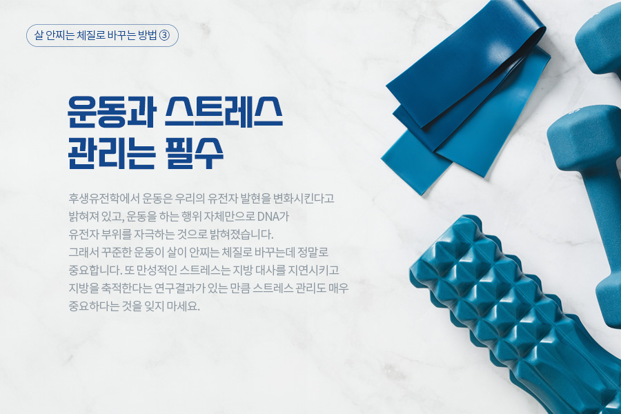 세 번째는 운동과 스트레스 관리입니다. 후생유전학에서 운동은 우리의 유전자 발현을 변화시킨다고 밝혀져 있고, 운동을 하는 행위 자체만으로 DNA가 유전자 부위를 자극하는 것으로 밝혀졌습니다. 그래서 꾸준한 운동이 살이 안찌는 체질로 바꾸는데 정말로 중요합니다. 또 만성적인 스트레스는 지방 대사를 지연시키고 지방을 축적한다는 연구결과가 있는 만큼 스트레스 관리도 매우 중요하다는 것을 잊지 마세요.