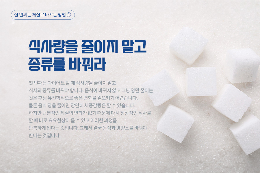 다이어트에 고민인 사람들이 많이 하는 이야기 인데요. 이럴 때 '체질이 달라서 그렇다'는 말을 많이 하곤 합니다. 체질은 주로 한의학에서 많이 쓰는 말인데요. 의학적으로 말하는 체질은 무엇일까요? 그것은 사람마다 타고난 유전적 특성과 함께 후천적으로 만들어지는 생화학적인 차별성이라고 말할 수 있습니다. 기능의학에서는 이를 '생화학적 차별성(Biochemical Individuality)'이라고 부릅니다. 그러면 체질은 바뀔 수 없는 것일까요? 대답은 NO입니다. 체질은 분명히 바뀔 수 있습니다. 이번 시간에는 살이 잘 찌는 체질을 살이 찌지 않는 체질로 바꾸는 의학적인 방법들을 알아보겠습니다.