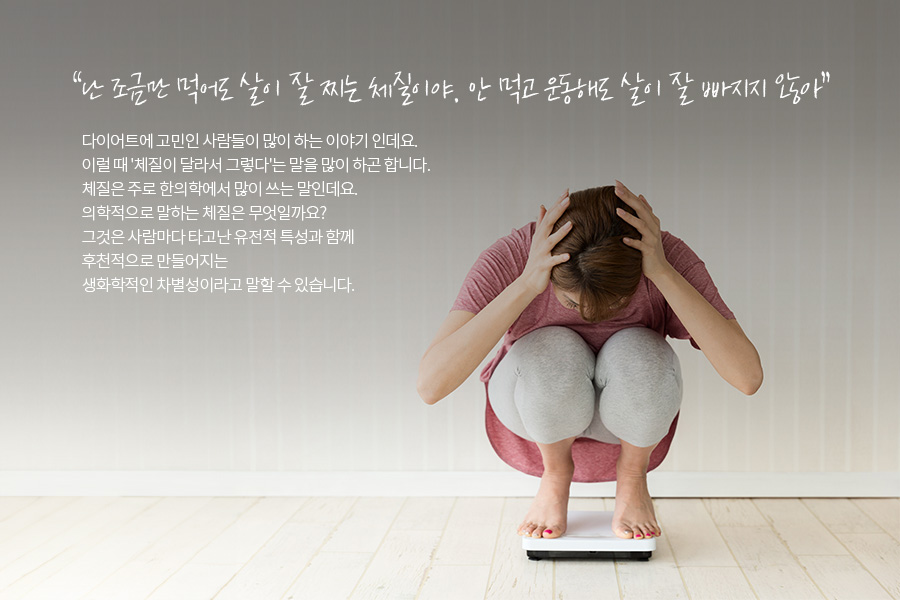 다이어트에 고민인 사람들이 많이 하는 이야기 인데요. 이럴 때 '체질이 달라서 그렇다'는 말을 많이 하곤 합니다. 체질은 주로 한의학에서 많이 쓰는 말인데요. 의학적으로 말하는 체질은 무엇일까요? 그것은 사람마다 타고난 유전적 특성과 함께 후천적으로 만들어지는 생화학적인 차별성이라고 말할 수 있습니다. 기능의학에서는 이를 '생화학적 차별성(Biochemical Individuality)'이라고 부릅니다. 그러면 체질은 바뀔 수 없는 것일까요? 대답은 NO입니다. 체질은 분명히 바뀔 수 있습니다. 이번 시간에는 살이 잘 찌는 체질을 살이 찌지 않는 체질로 바꾸는 의학적인 방법들을 알아보겠습니다.