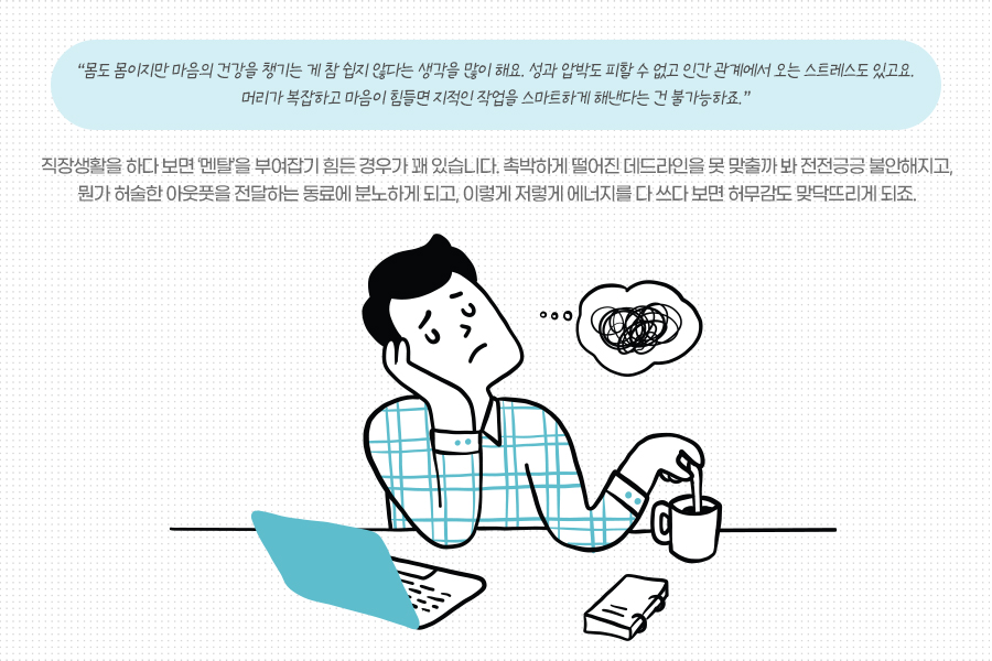 직장생활을 하다 보면 ‘멘탈’을 부여잡기 힘든 경우가 꽤 있습니다. 촉박하게 떨어진 데드라인을 못 맞출까 봐 전전긍긍 불안해지고, 뭔가 허술한 아웃풋을 전달하는 동료에 분노하게 되고, 이렇게 저렇게 에너지를 다 쓰다 보면 허무감도 맞닥뜨리게 되죠. 오죽하면 최근엔 ‘직장생활이 최고의 수행이다’라는 제목의 책이 나올 정도입니다.