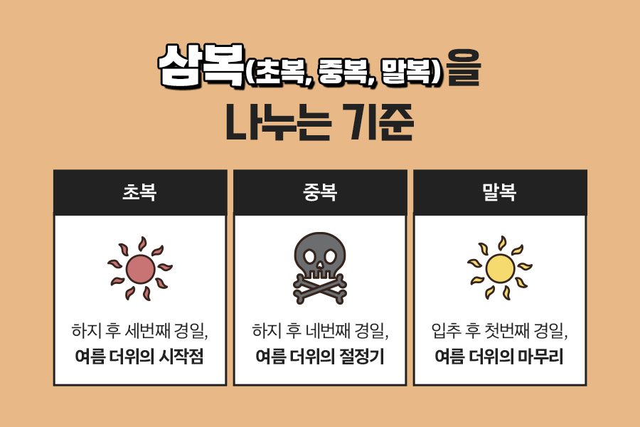 복(伏)은 사람이 엎드려 있는 형상으로 여름의 더운 기운이 가을의 서늘한 기운을 세 번 제압하여 굴복시켰다고 하여 삼복이라고 부르기 시작하였습니다.
