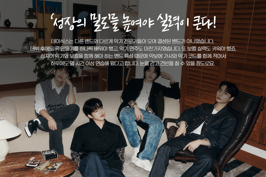 데이식스는 다른 밴드와 다르게 악기 전문가들이 모여 결성된 밴드가 아니였습니다. 그들은 ‘데뷔를 위해’ 악기 연주와 곡 만들기를 시작했고 데뷔 무대는 힘들게 만들어졌습니다. 데뷔 후에도 곡 만들기를 하나씩 배워야 했고, 악기 연주도 마찬가지였습니다. 또 보컬 실력도 키워야 했죠. 심지어 악기와 보컬을 함께 해야 하는 밴드 특성 때문에 악보에 가사와 악기 코드를 함께 적어서 하루에도 열 시간 이상 연습해 왔다고 합니다. 눈을 감고 건반을 칠 수 있을 정도로요.