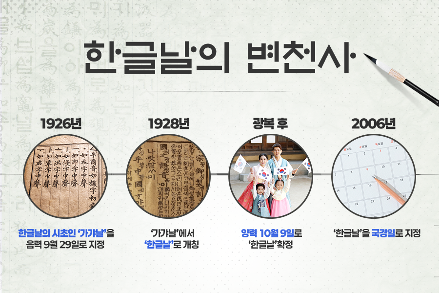 1926년에 음력 9월 29일로 처음 지정된 ‘가갸날’이 한글날의 시초입니다. 이후 1928년에 ‘한글날’로 개칭되었고, 광복 후 양력 10월 9일로 확정되었으며, 2006년부터는 국경일로 지정되었습니다. 그렇다면 한글에 대해 조금 더 알아볼까요?
