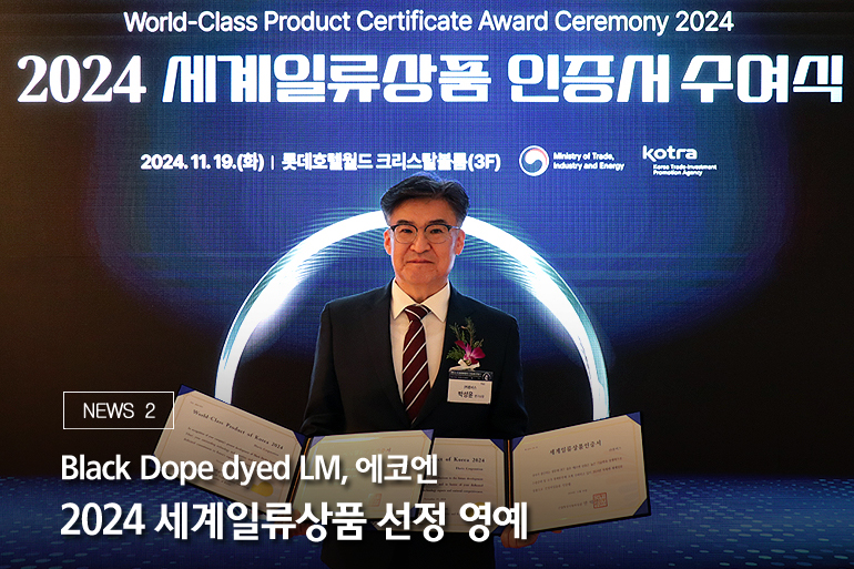 현재 세계일류상품으로 선정된 Black Dope dyed LM은 방사 과정에서 Core 부분에 Black 색상을 복합 방사하여 자동차용 소재에서 요구되는 짙고 선명한 색상을 구현하였으며, 후가공 염색보다 Blackness 표현 및 견뢰도가 우수한 것이 특징입니다. 차세대 세계일류상품으로 선정된 에코엔은 사용 후 매립 시 미생물에 의해 3년 내 생분해 가능한 고내열성 생분해 폴리에스터 섬유로 소각 시 발생하는 이산화탄소 및 유해가스가 없어 친환경적이며, PLA 대비 사용 수명이 길고 내열성이 우수하여 의류, 현수막 등 친환경 제품으로의 용도 확대를 위한 연구개발을 진행하고 있습니다.