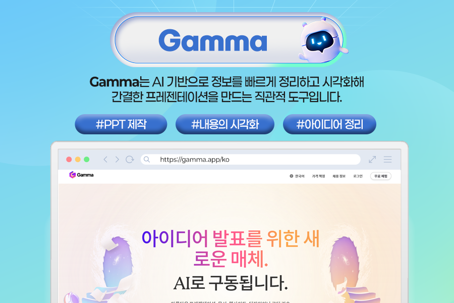 Gamma는 AI 기반의 프레젠테이션, 문서, 웹페이지 생성 도구입니다. 사용자가 입력한 텍스트와 데이터를 바탕으로 AI가 자동으로 레이아웃과 디자인을 구성하여 시각적으로 매력적이고 전문적인 콘텐츠를 생성해줍니다.