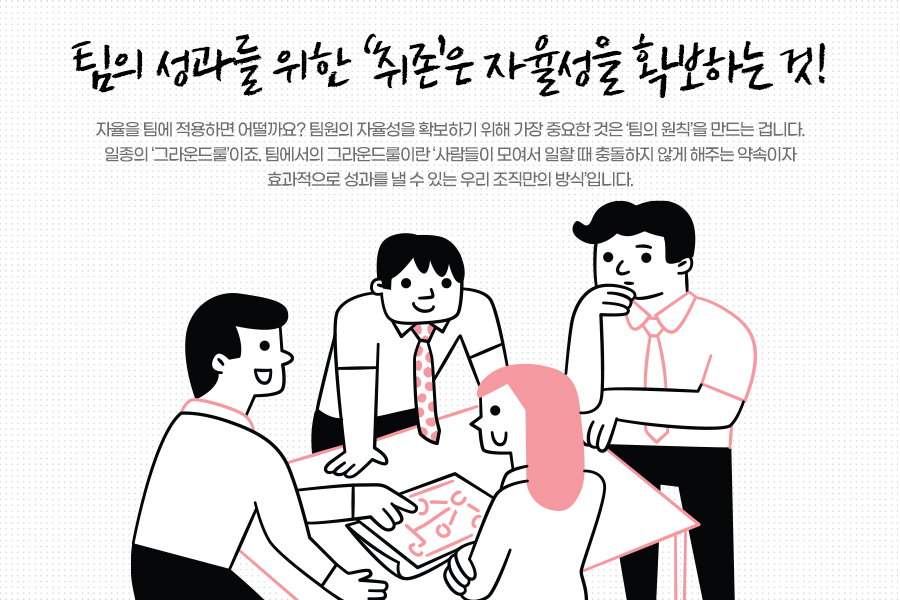 자율을 팀에 적용하면 어떨까요? 팀원의 자율성을 확보하기 위해 가장 중요한 것은 ‘팀의 원칙’을 만드는 겁니다. 일종의 ‘그라운드룰’이죠. 팀에서의 그라운드룰이란 ‘사람들이 모여서 일할 때 충돌하지 않게 해주는 약속이자 효과적으로 성과를 낼 수 있는 우리 조직만의 방식’입니다.