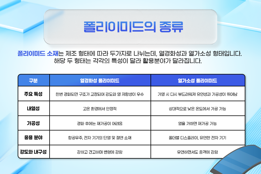 폴리이미드라고 해서 모두 폴더블폰에 사용되는 것이 아니라 제조형태에 맞는 폴리이미드를 사용하게 되는데요. 폴리이미드는 열경화성과 열가소성 두 가지 형태로 나뉩니다. 열경화성 폴리이미드는 한번 경화되면 높은 강도와 열 저항성을 가지며, 고온 환경에서 안정적으로 작동합니다. 반면 열가소성 폴리이미드는 가열 시 다시 부드러워지는 특성이 있어 유연성과 가공성이 뛰어나며, 폴더블 디스플레이와 같은 응용에 적합합니다. 두 형태 모두 각각의 특성을 바탕으로 다양한 산업과 제품에서 활용되고 있습니다.