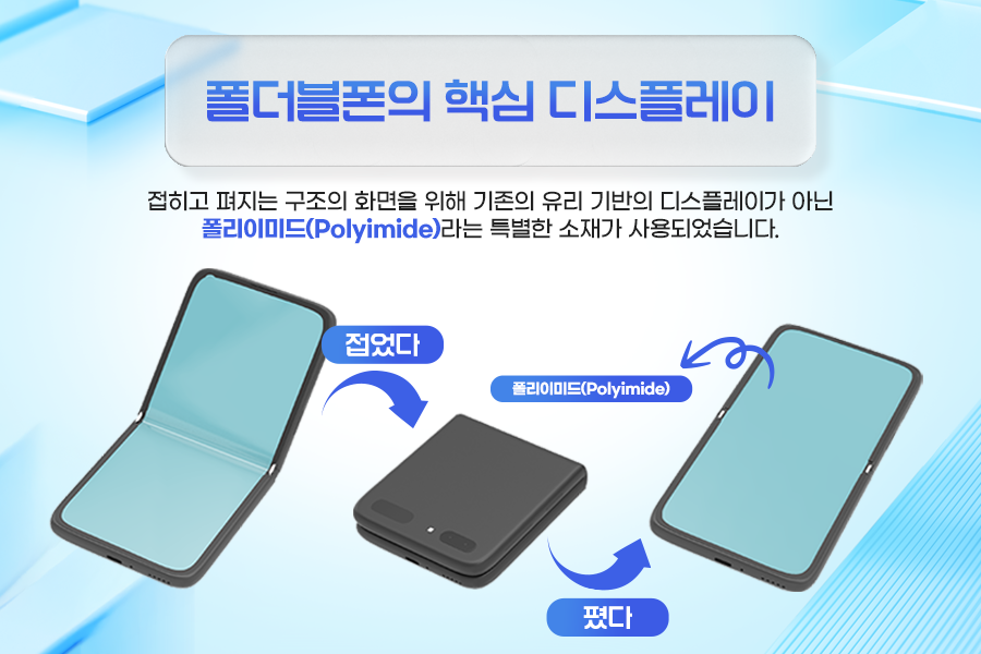 폴더블폰의 가장 큰 특징은 화면이 접히고 펴지는 구조입니다. 이 기술은 단순한 혁신을 넘어 스마트폰 사용 방식을 완전히 바꾸는 역할을 하고 있는데요. 하지만 이런 디스플레이가 가능하기 위해서는 기존의 유리 기반 디스플레이로는 해결할 수 없는 과제가 많았는데요. 기술의 발전과 소재의 발전으로 폴리이미드(Polyimide)라는 특별한 소재를 통해 기존의 디스플레이의 문제를 해결할 수 있었습니다.