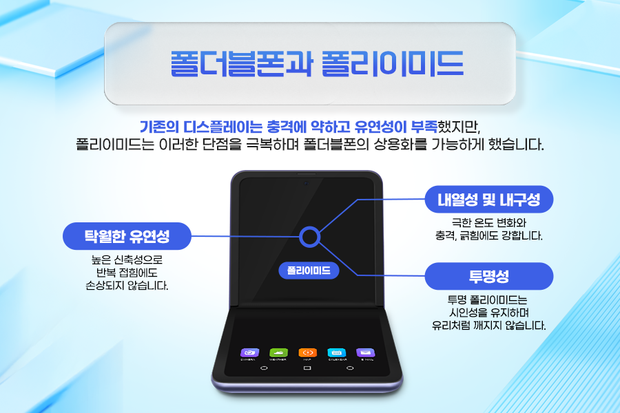 폴리이미드는 접히는 디스플레이의 핵심 기술로 자리 잡았는데요. 기존의 디스플레이는 충격에 약하고 유연성이 부족했지만, 폴리이미드는 이러한 단점을 극복하며 폴더블폰의 상용화를 가능하게 했습니다. 폴리이미드는 아래의 특징적인 요소로 인해 폴더블폰에 사용되었습니다.