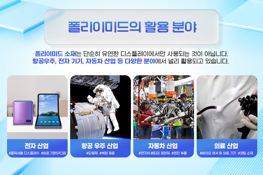 그렇다면 폴리이미드는 어떤 분야에서 사용되고 있을까요? 우선, 전자 산업에서는 플렉서블 디스플레이와 고성능 회로 기판(PCB)에 사용되며, 항공우주 산업에서는 항공기와 우주선의 단열재 및 경량 구조재로 활용됩니다. 또한, 자동차 산업에서는 전기차 배터리의 절연 소재와 엔진 부품에 필수적으로 쓰이고, 의료 산업에서는 바이오 센서와 의료 기기의 보호 코팅으로 사용됩니다. 이처럼 폴리이미드는 첨단 기술과 제품 개발에 없어서는 안 될 재료로, 다양한 산업에서 폭넓게 기여하고 있습니다.