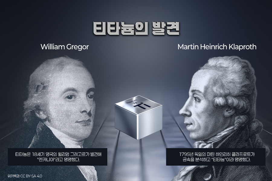티타늄은 18세기 영국의 광물학자 윌리엄 그레고르에 의해 처음 발견되었습니다. 그는 영국 메나칸 해안가에서 발견한 검은색 모래에서 새로운 금속 성분을 발견하고 이를 "멘카니아"라고 명명했습니다. 이후 1795년 독일의 화학자 마틴 하인리히 클라프로트가 이 금속을 다시 분석하며 '타이탄(Titans, 그리스 신화의 거인족)'에서 영감을 받아 "티타늄"이라는 이름을 붙였습니다. 그러나 순수한 형태의 티타늄을 분리하고 대량 생산하는 것은 20세기 중반이 되어서야 가능해졌습니다.