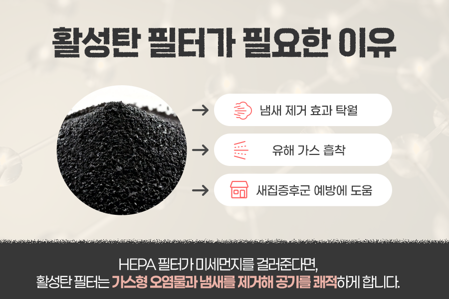일반적으로 HEPA 필터가 미세먼지와 초미세먼지를 걸러주는 역할을 한다면, 활성탄 필터는 눈에 보이지 않는 가스 형태의 오염물질과 냄새를 제거해 공기 질을 더욱 쾌적하게 만들어줍니다.
