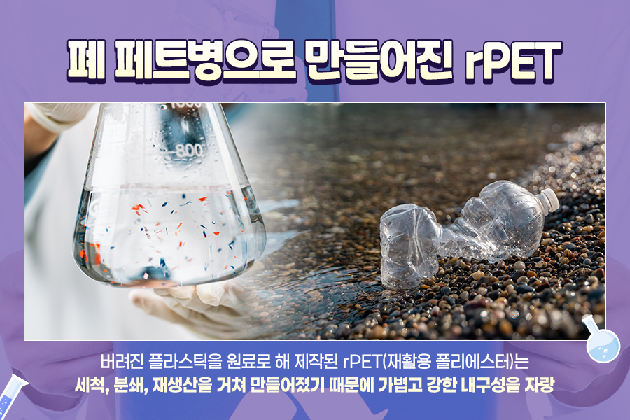 버려진 플라스틱을 리사이클링 해 만든 소재 중 하나인 rPET(재활용 폴리에틸렌 테레프탈레이트)는 버려진 페트병을 원료로 해 제작된다고 합니다. 세척, 분쇄, 재생산을 거쳐 오로지 폐 폐트병만을 활용해 만들어지며, 이 때문에 투명하거나 반투명한 색을 띠고, 가볍고 강한 내구성을 자랑하는데요.