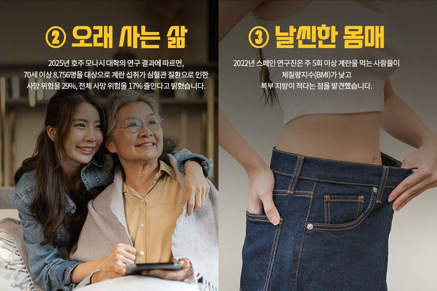 두 번째, 오래 사는 삶입니다. 2025년 호주 모나시 대학의 연구 결과에 따르면, 70세 이상 8,756명을 대상으로 계란 섭취가 심혈관 질환으로 인한 사망 위험을 29%, 전체 사망 위험을 17% 줄인다고 밝혔습니다. 계란 한두 개가 매일 아침 우리를 더 건강한 미래로 이끌어주는 셈입니다. 세 번째, 계란은 날씬한 몸매를 꿈꾸는 분들에게 도움을 줍니다. 2022년 스페인 연구진은 주 5회 이상 계란을 먹는 사람들이 체질량지수(BMI)가 낮고 복부 지방이 적다는 점을 발견했습니다. 다이어트 중이라면, 달걀은 포만감을 주면서도 칼로리를 조절하는 데 최적의 선택입니다.