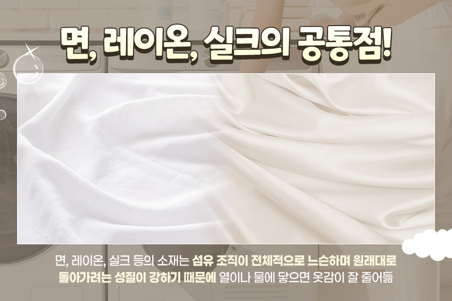 또한 옷감 중에서도 유독 잘 줄어드는 소재들이 있는데요, 대표적으로 면, 레이온, 실크 등이 있습니다. 이 소재의 공통점은 섬유 조직이 전체적으로 느슨하다는 점인데요.