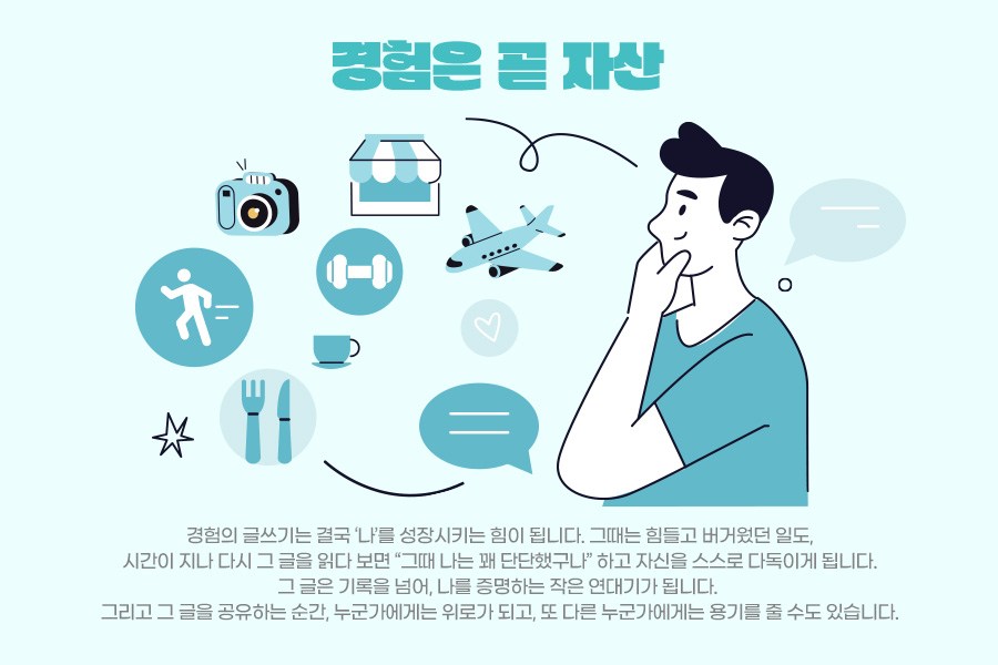경험의 글쓰기는 결국 ‘나’를 성장시키는 힘이 됩니다. 그때는 힘들고 버거웠던 일도, 시간이 지나 다시 그 글을 읽다 보면 “그때 나는 꽤 단단했구나” 하고 자신을 스스로 다독이게 됩니다. 그 글은 기록을 넘어, 나를 증명하는 작은 연대기가 됩니다. 그리고 그 글을 공유하는 순간, 누군가에게는 위로가 되고, 또 다른 누군가에게는 용기를 줄 수도 있습니다.
