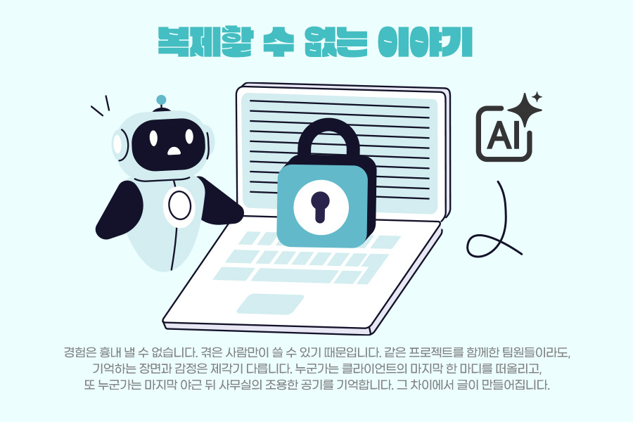 경험은 흉내 낼 수 없습니다. 겪은 사람만이 쓸 수 있기 때문입니다. 같은 프로젝트를 함께한 팀원들이라도, 기억하는 장면과 감정은 제각기 다릅니다. 누군가는 클라이언트의 마지막 한 마디를 떠올리고, 또 누군가는 마지막 야근 뒤 사무실의 조용한 공기를 기억합니다. 그 차이에서 글이 만들어집니다.