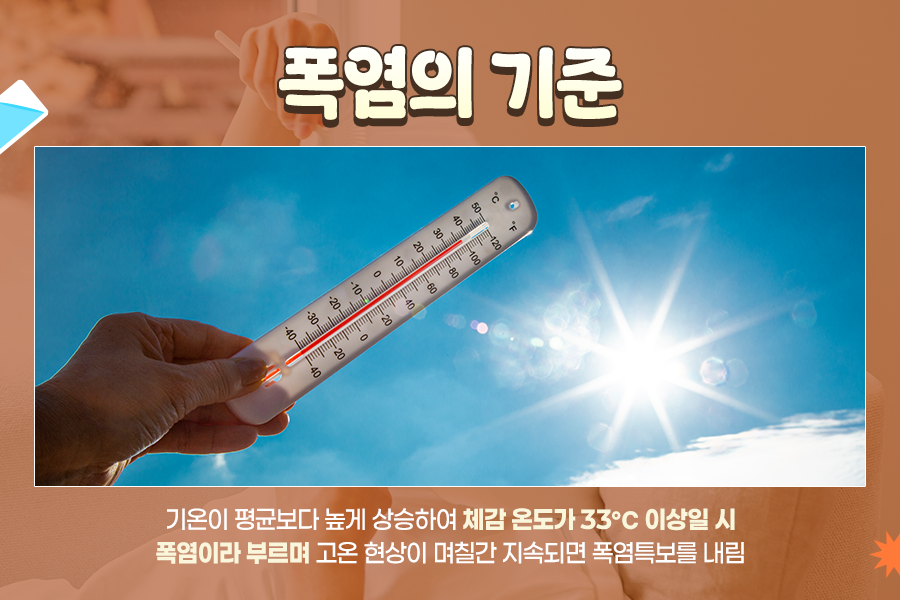 폭염은 일반적으로 기온이 평균보다 높게 상승하여 체감 온도 33℃ 이상의 고온이 지속되는는 현상을 뜻합니다. 폭염 기온이 더욱더 높아지고 지속될 시 폭염특보를 발표하곤 하는데요.