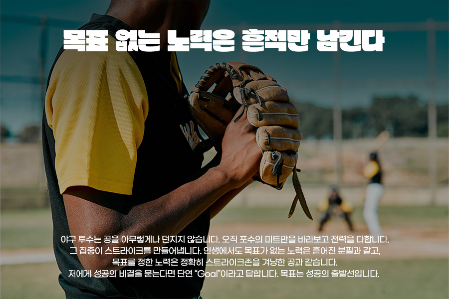 야구 투수는 공을 아무렇게나 던지지 않습니다. 오직 포수의 미트만을 바라보고 전력을 다합니다. 그 집중이 스트라이크를 만들어냅니다. 인생에서도 목표가 없는 노력은 흩어진 분필과 같고, 목표를 정한 노력은 정확히 스트라이크존을 겨냥한 공과 같습니다. 저에게 성공의 비결을 묻는다면 단연 “Goal”이라고 답합니다. 목표는 성공의 출발선입니다. 과녁이 없는 인생은 지치고 재미없습니다. 반대로 과녁이 있는 사람은 눈빛이 살아 있고, 얼굴에는 열정이 묻어납니다.