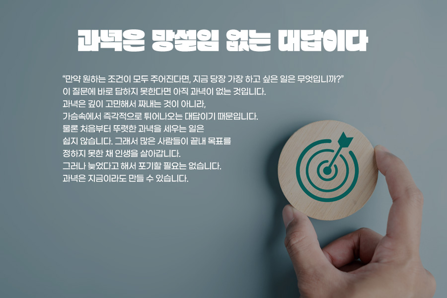 “만약 원하는 조건이 모두 주어진다면, 지금 당장 가장 하고 싶은 일은 무엇입니까?” 이 질문에 바로 답하지 못한다면 아직 과녁이 없는 것입니다. 과녁은 깊이 고민해서 짜내는 것이 아니라, 가슴속에서 즉각적으로 튀어나오는 대답이기 때문입니다. 물론 처음부터 뚜렷한 과녁을 세우는 일은 쉽지 않습니다. 그래서 많은 사람들이 끝내 목표를 정하지 못한 채 인생을 살아갑니다. 그러나 늦었다고 해서 포기할 필요는 없습니다. 과녁은 지금이라도 만들 수 있습니다.