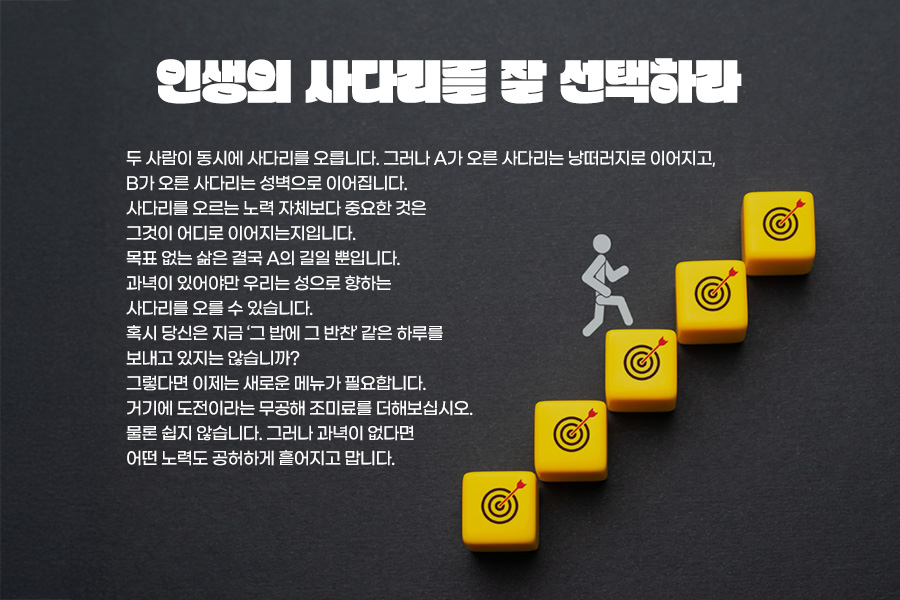 혹시 당신은 지금 ‘그 밥에 그 반찬’ 같은 하루를 보내고 있지는 않습니까? 그렇다면 이제는 새로운 메뉴가 필요합니다. 거기에 도전이라는 무공해 조미료를 더해보십시오. 물론 쉽지 않습니다. 그러나 과녁이 없다면 어떤 노력도 공허하게 흩어지고 맙니다.