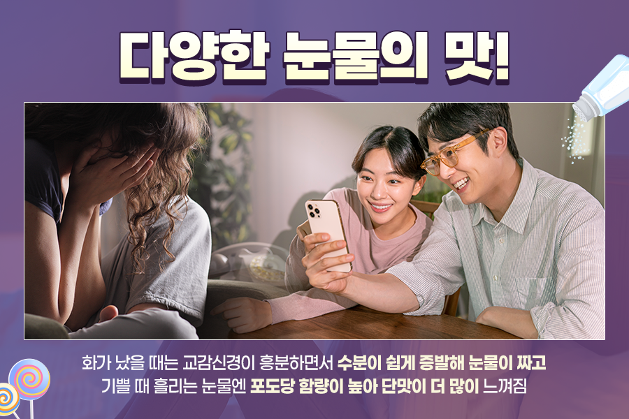 기쁠 때나 슬플 때, 우리 눈에서는 저절로 눈물이 흐르곤 합니다. 눈물은 흔히 ‘마음의 언어’라고도 하는데요. 그래서 이런 걸까요? 신기하게 눈물은 감정에 따라 짠맛, 단맛 등등… 맛이 달라진다고 합니다.