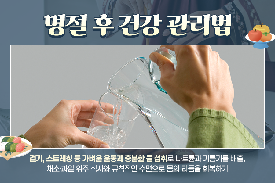 명절 후에는 활동량을 회복하기 위해 가볍게 몸을 움직여 주는 것이 좋은데요. 갑자기 무리한 운동을 하기보다는 걷기나 스트레칭처럼 부담 없는 활동부터 시작하는 것이 효과적입니다. 또한 연휴 동안 쌓인 나트륨과 기름기를 배출하기 위해 물을 충분히 마셔 주는 것도 필요하죠.
