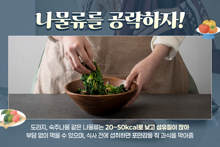 그렇다면 추석 음식은 전부 열량이 높은 음식인 걸까요? 그렇지는 않습니다. 도라지, 숙주나물 무침 등 나물 종류의 음식들은 칼로리가 낮고(20~50kcal) 섬유질로 구성되어 있어 부담 없이 섭취할 수 있는데요.