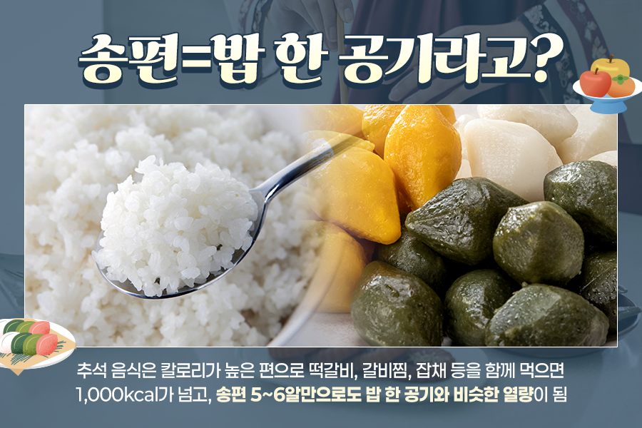 식사 후 디저트 칼로리도 무시할 수 없습니다. 송편, 인절미, 한과 등 각종 디저트는 열량을 계산해 보면 밥 한 공기를 훌쩍 넘는데요. 특히 송편은 5~6알만 먹어도 공기밥과 비슷한 열량이라고 하니 만만하게 보면 안될 것 같습니다.